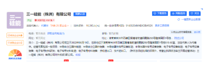 ▲2022年8月,三一硅能(株洲)有限公司成立,注冊資本10億元,由三一國際100%間接控股
